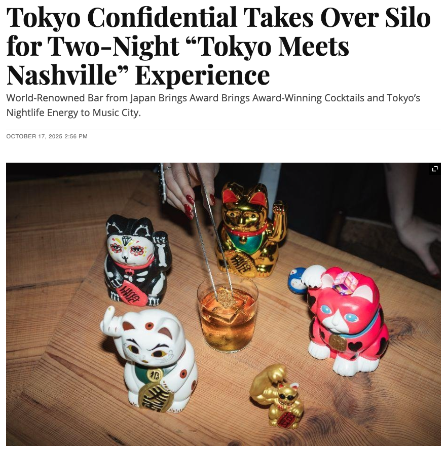 I led local public relations and influencer strategy for a two-day takeover by Tokyo Confidential, one of the world’s most renowned bars, at Silo, the restaurant inside Canopy by Hilton Nashville. The high-profile activation brought the acclaimed Tokyo bar concept to Nashville for a limited-time experience, generating buzz and positioning Canopy as a destination for elevated programming and culturally relevant moments in the city.